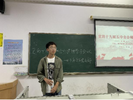学习会议在庄严的国歌中拉开序幕,随后陈卓、廖伟杰、王远一、封礼荣、郭俊含、傅青达六位同学依次就十九届五中全会部分内涵做了深入的解读。充分让大家认识和了解党的十九届五中全会中全面建成小康社会,国家发展环境深刻而复杂的变化及“十四五”规划工作要求中关于深化改革构建高水平社会主义经济体制、乡村振兴、国防和军队的现代化建设、创新和现代产业体系发展四个大方面的深刻内涵。