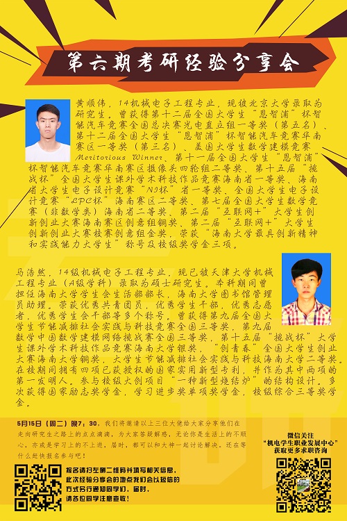 为帮助同学们明确考研备考思路,确立科学复习规划, 英国威廉希尔公司于2018年5月17日晚7:30在研发楼417,成功举办了第五期考研经验分享会。出席分享会的有考取北京大学的黄顺伟和考取天津大学的马浩然两位学长,参加分享会的有十余名想了解考研相关知识的同学,会议由职业发展中心的韩圣主持。