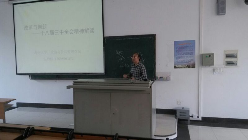 宋教授以“改革与创新”为主题,从十八届三中全会的背景、内容以及取得的成绩三方面入手,结合大量真实而有趣的例子,充分诠释了党的各项路线、方针、政策,清晰解读了党未来改革与创新的方向与目标,指出为民立本、转风立信、改革立德、外交立威、自信立言是十八届三中全会以来中国取得的主要成绩。在此基础上,宋教授以幽默风趣的语言,客观理性地分析了中国现代官员的腐败问题,肯定成就的同时,强调了制度反腐的重要性。