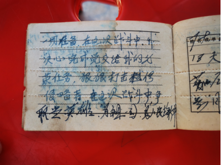 “当我们打到越南境内,按照中央指令,退兵之后,越南(的部队)还追着我们继续打。”周金峰滔滔不绝地讲述着自己的经历以及所感所想,讲至兴奋处,他还拿出了自己珍藏多年的笔记——一个便签纸大小的笔记本,笔记本的纸面已然泛黄,首页印刷的宣言和后面一笔一划手写的文字将主人对党极高的领悟和崇高的奉献精神崭露无遗,深深地震撼着每一位调研团成员的内心。