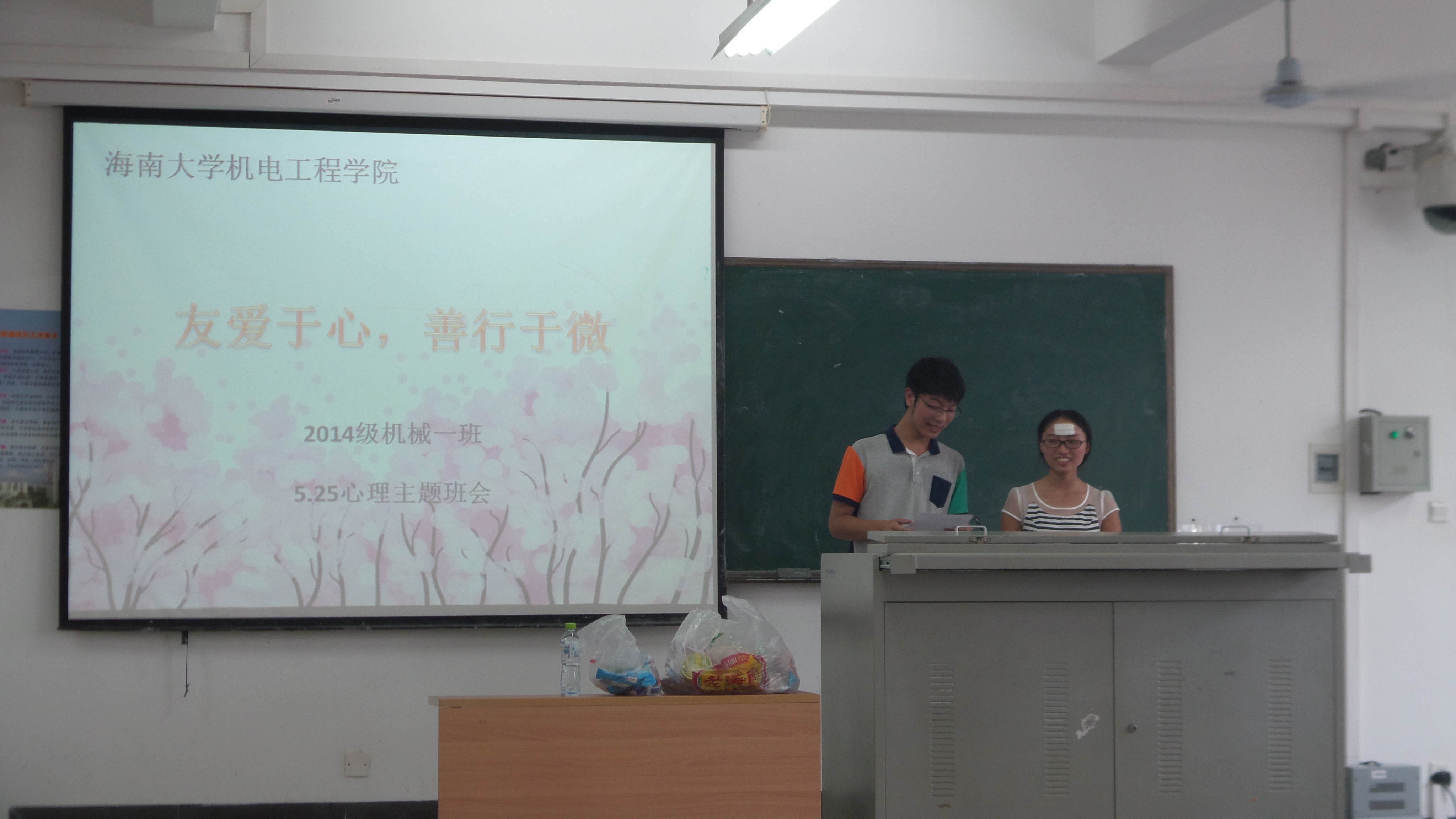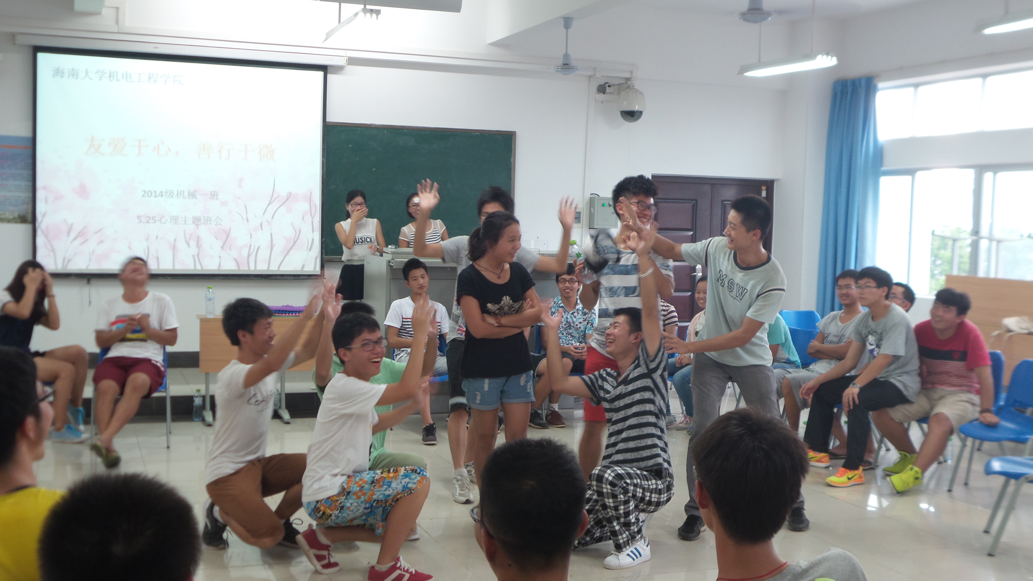 为了增强我院学生的心理健康意识,提高自我调适能力,促进大学生心理健康教育工作的开展。按照学校5.25心理活动月的统一安排,5月26日下午四点三十,2014级机械设计制造及其自动化1班在4教412举行了“友爱于心,善行于微”主题心理团体辅导班会。李青老师以及14级机械1班全体学生参加了此次班会。