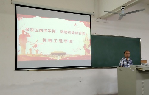 动员大会在全体机电学子的殷殷期盼中拉开序幕,主持人张小其老师宣布动员大会正式开始。动员会主讲人董赫老师向同学们强调了责任的重要性,他说:“身为一名中国人,我们都应该有保家卫国的责任;作为一名大学生,我们更应该积极响应国家号召,参军入伍保家卫国”。而后,董赫老师分别从国家和个人层面向同学们展示为什么祖国需要大学生入伍参军,当代有志青年又为什么要携笔从戎进军营:对于国家来说,民族复兴的中国力量需要坚强的国防来支撑,体系重塑的一流军队需要优质兵员做脊梁;对于个人而言,正当芳华的有志青年需要熔炉淬炼方成大业,军队的历练能够对一个人的意志品德、能力素质、纪律观念、奉献精神等进行全方位的塑造。接下来,董赫老师用幽默诙谐的讲授方式,向同学们详细介绍了国家以及海南大学对于大学生参军的优抚优待和政策支持,现场氛围达到了高潮。