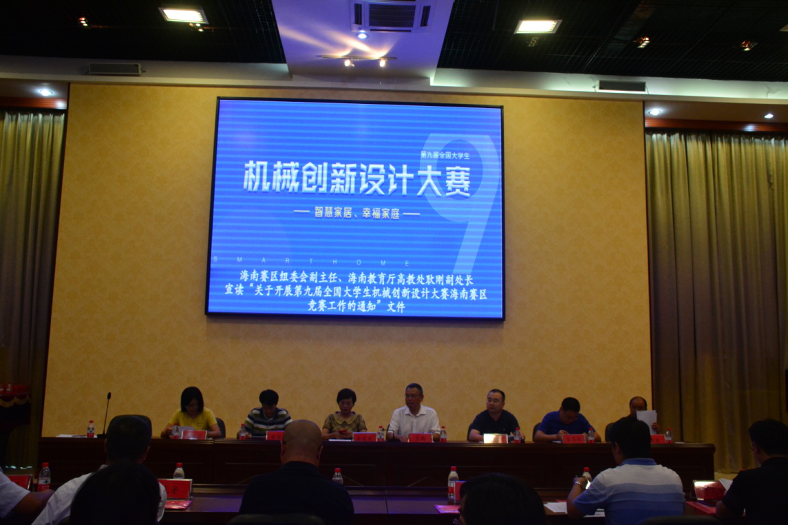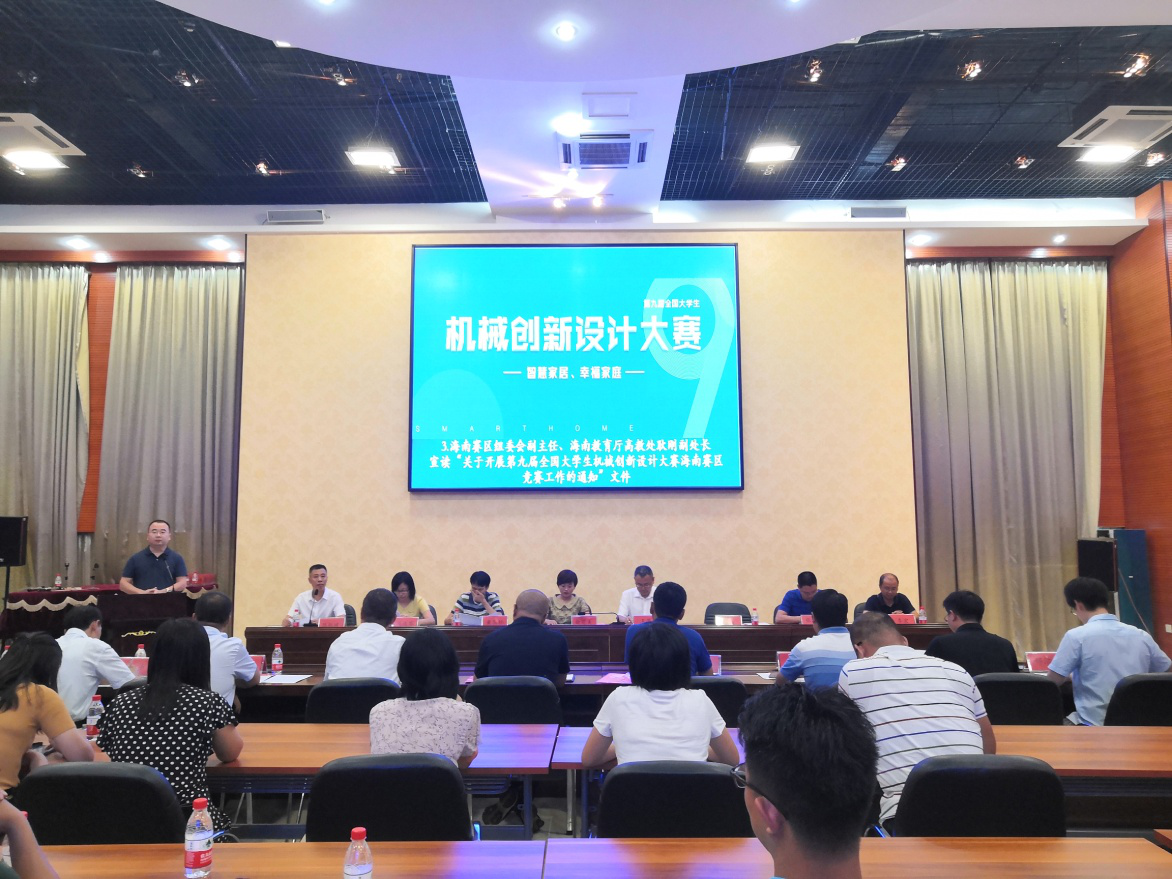 随后,由海南赛区组委副主任、海南教育厅高教处副处长耿刚宣读了“关于开展第九届全国大学生机械创新设计大赛海南赛区竞赛工作的通知”,介绍了大赛的情况,客观分析了我省机械学科建设情况,强调了“以赛促学、以赛促教、以赛促改”的理念,对大赛目的、主题内容、条件要求、赛事组织安排、奖项设立以及评选方式等进行了说明。