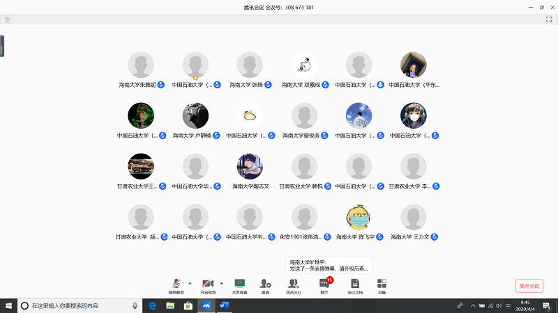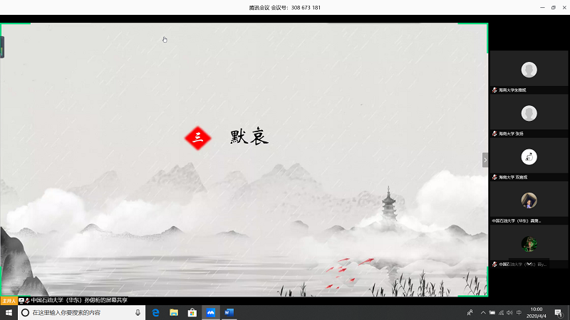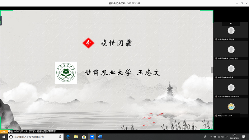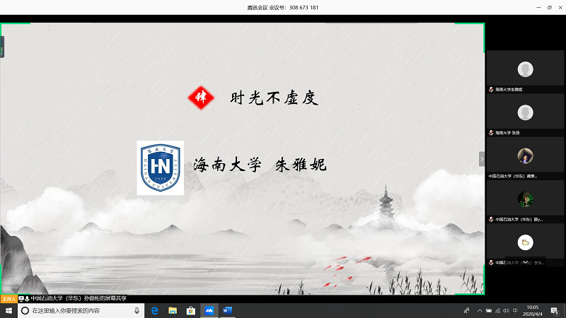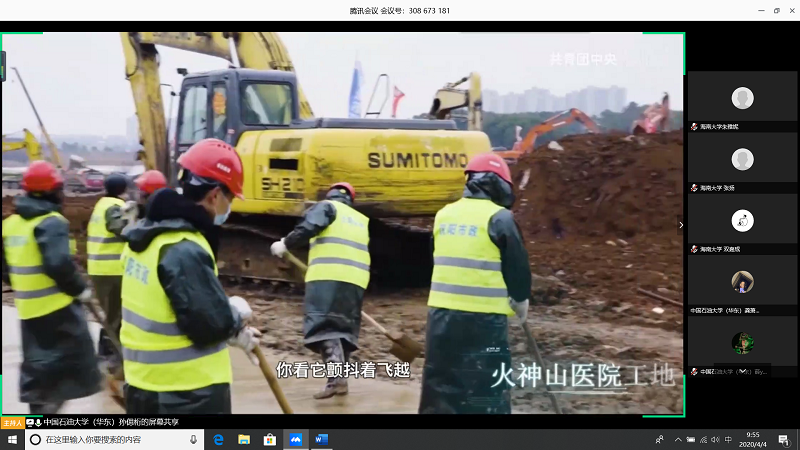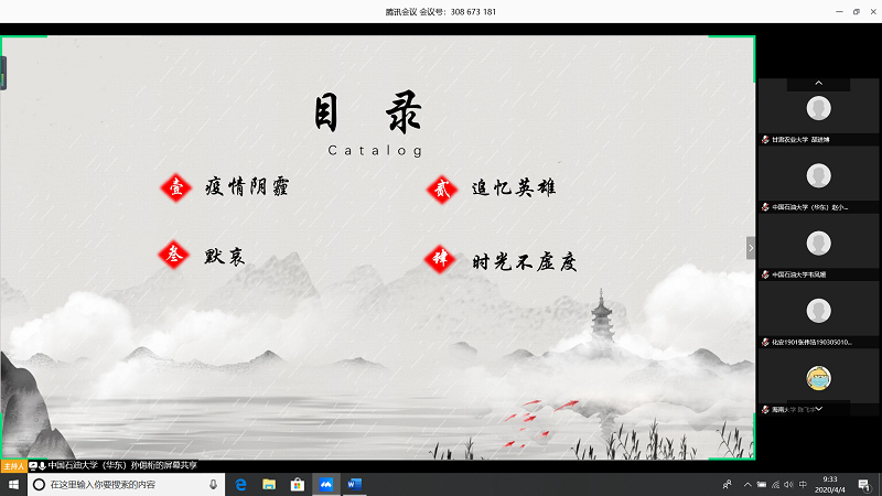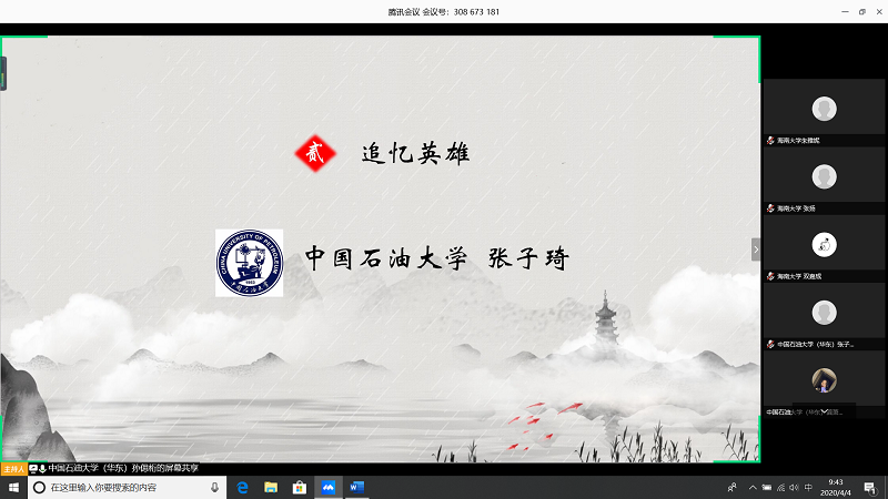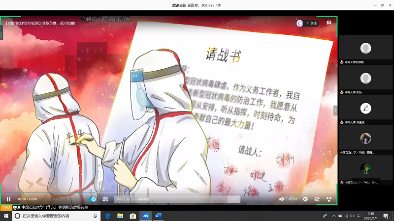 会上,由甘肃农业大学王志文同学带我们回顾疫情,虽然国内疫情已经有所缓解但是同学们还是不能放松警惕;中国石油大学(华东)张子琦同学带领大家向抗疫英雄致敬,十点开始全体起立默哀三分钟;海南大学朱雅妮为大家强调线上上课等同于课堂教学,在家学习不能懈怠,合理规划疫情期间的学习和课程安排。