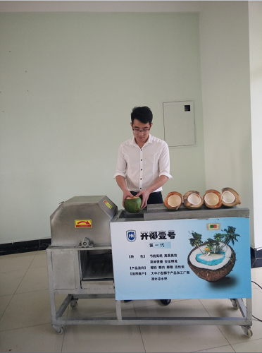 李伟在帮助工厂摘椰子、加工椰子的过程中,体察到了传统加工椰子的缺陷,于是萌发出研制开椰神器的想法。他和他的团队为了研发开椰机器,走访海南无数家椰子加工企业。通过调研,他们了解到海南的椰子加工企业有200多家,传统的椰子加工设备由于其体积庞大,价格高昂,使得未能在中小型企业中推广利用起来,多数椰子加工企业在加工过程中仍需靠人工,这样不仅耗时耗力,效率低下,并且可能会造成生产事故。有了目标和方向后,李伟及其团队分兵几路,定方案、制图纸、建模型,先后历时四个月。他们结合传统椰子加工设备,将其过程简化为推送、切割、收集等三个环节,改向上的牵引带为平行的传送带,利用小功率马达驱动机器,很大程度上减少了能耗,提高了效率。据了解,这台机器在消耗两度电的情况下每小时能够剥离椰壳1800个,并且重量仅为传统设备的四分之一,为椰子加工企业提供了诸多便利。不仅如此,李伟及其团队精益求精,在一些防护和其他细节方面也作出了改进,例如在锯片下方增设滤网,防止椰壳碎屑对汁水的污染;抬高汁水收集区底部钢板的倾斜角,方便汁水迅速流出等。