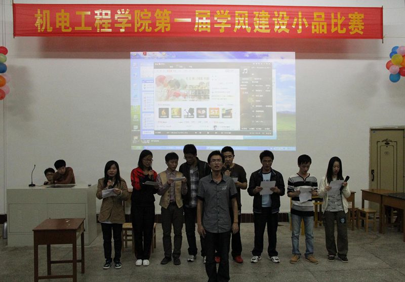 为了推进我院学风建设工作,积极倡导和努力培养优良学风,营造良好的学习氛围,形成好的学习风气。我院于12月6日晚7:30在儋州校区47课室举办了学风建设小品大赛。比赛得到了同学们的积极响应,共个7班级、3个系党支部参与比赛。机械系梁栋副主任、学工办崔建兵、姚广龙、孙佑攀等老师出席并担任评委,和我院四百多名学生一同观看了比赛。