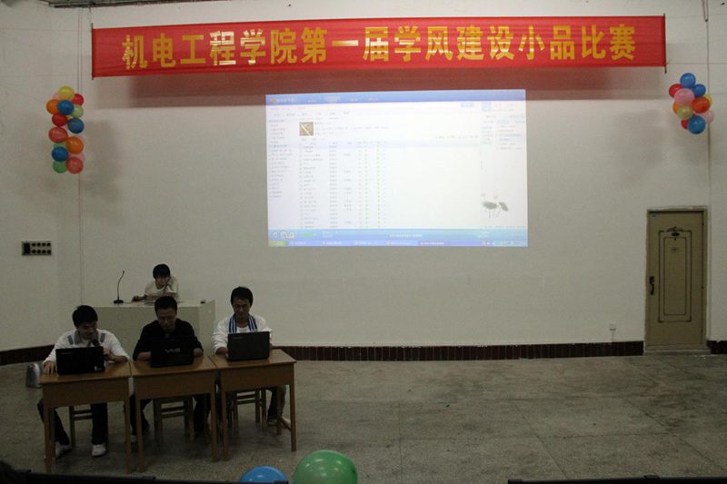 此次比赛分两组进行。首先上场的是09机械2班,他们表演的从一个侧面反映了大学学习中存在的一些问题,以幽默的对白给大家以警醒,你一言我一句带动了现场气氛,为比赛开了好头。之后上场一系列小品更是引起现场笑声连连。机械系党支部准备的小品,演绎了现在极少学生整天沉迷游戏,考试过程中作弊的场景。告诫同学们考试不能作弊,平时要努力学习才能考出好成绩。尤其是由09电气1班带来的小品集幽默的语言和夸张的舞蹈于一体,将比赛现场的气氛推向高潮,全场掌声雷动,延绵不绝。告诫同学们我们不能忘来大学的目的,时刻不要忘了学习,不要辜负父母、老师及社会对我们的期望。09电气2班的,讲述的是一名大学生丢弃了理想,随波逐流,在舍友的鼓励下,重拾理想,为自己未来蓄势待发。