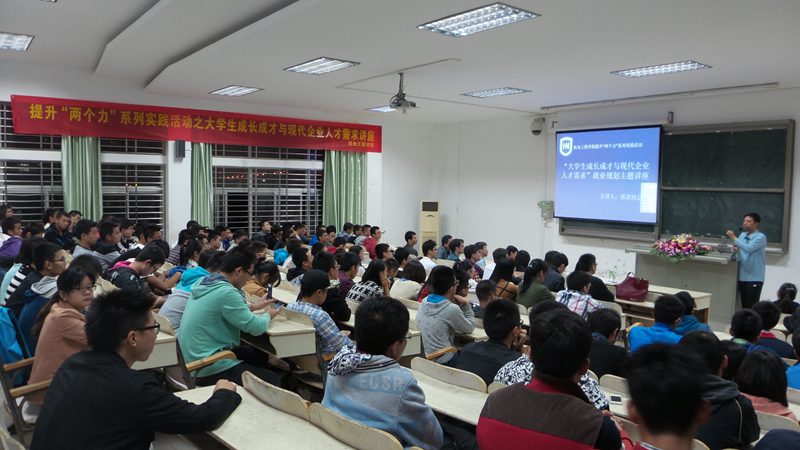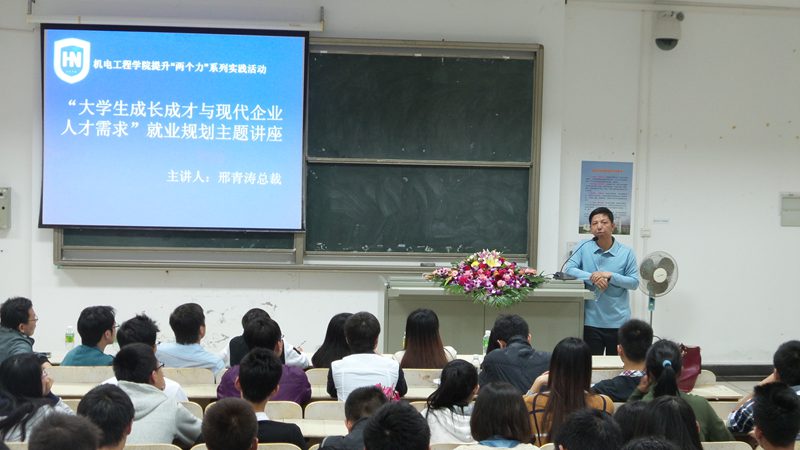 会议伊始,黄国标副书记与在场师生一道表达了对邢总一行人此次到来的热烈欢迎并介绍了邢总的基本情况。在讲座中,邢总从他自身经历谈起,从适应大学生活、实现角色转换,到就业创业、留学考研,他以亲切幽默的口吻以及真挚的情感拉近了与学生的距离,讲述了一个又一个催人奋进的故事。