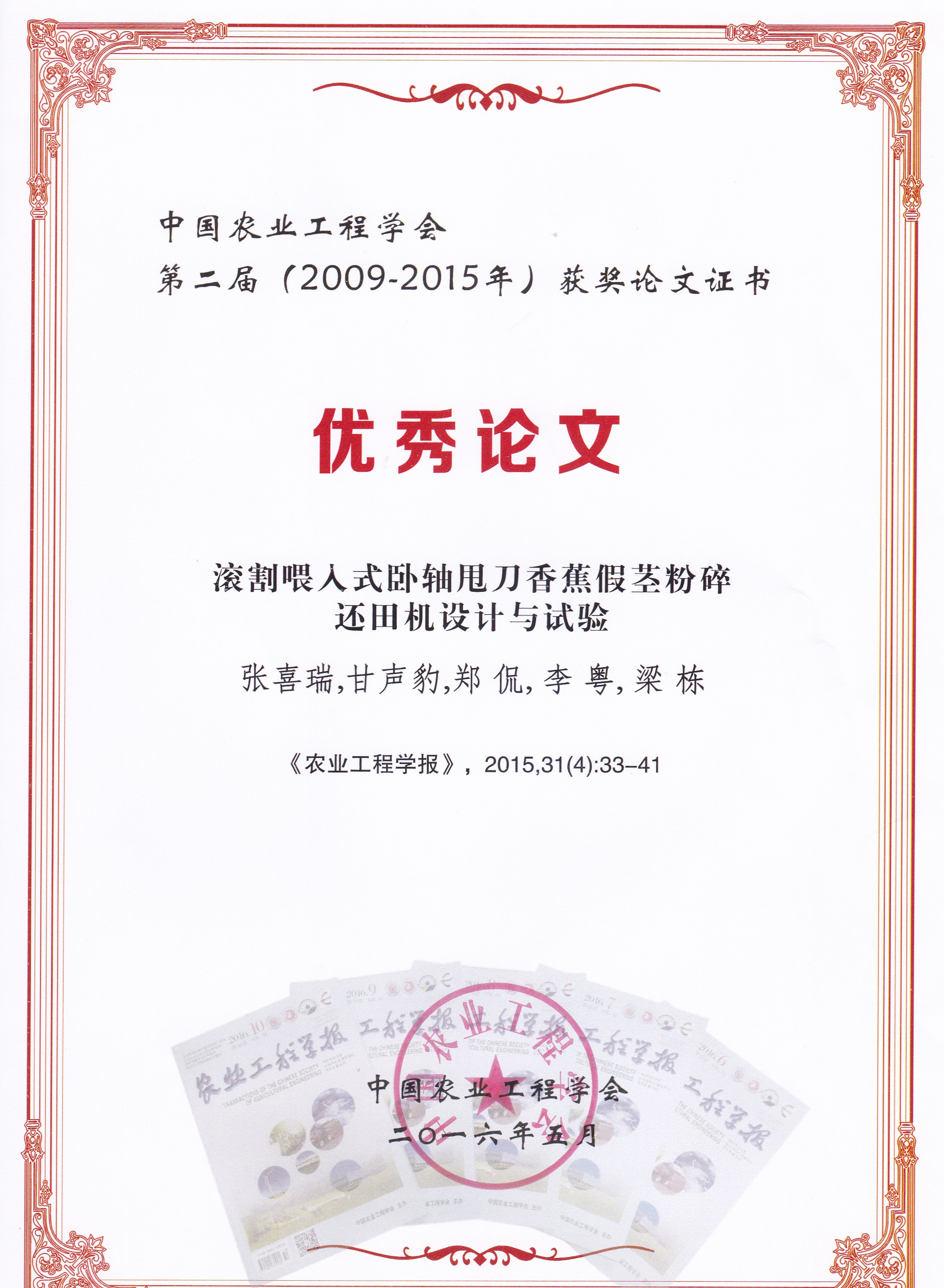 近日,我院热带作物秸秆机械化技术课题组两篇《农业工程学报》论文入选“中国农业工程学会第二届优秀论文”。两篇论文分别是“滚割喂入式卧轴甩刀香蕉假茎粉碎还田机设计与试验”(通讯作者:张喜瑞副教授)、“喂入式立轴甩刀香蕉秸秆粉碎还田机设计与试验”(通讯作者:李粤教授)。继2009年中国农业工程学会第一届优秀论文评选后,中国农业工程学会今年启动了第二届优秀论文评选。本届优秀论文评选范围是《农业工程学报》2009-2015年刊发的论文,优秀论文遴选采用文献指标定量与发表时专家评审意见定性相结合,提出候选论文,由中国农业工程学会组织专家评审。
