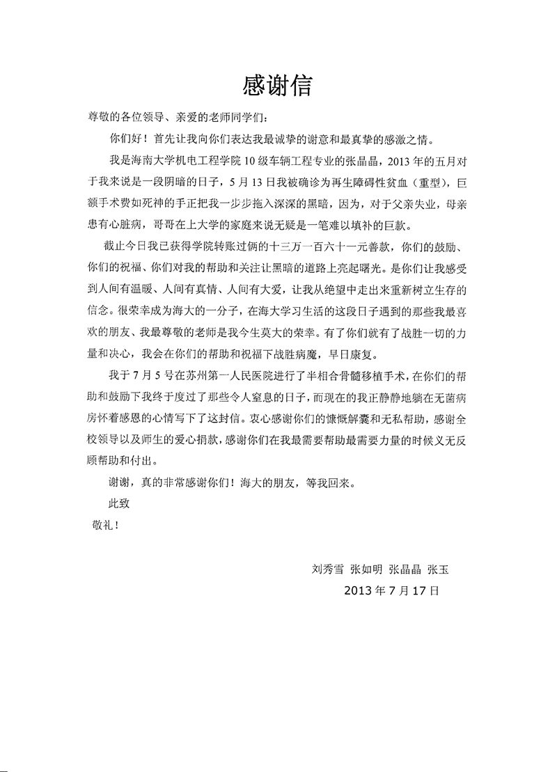 当年轻的生命正焕发着青春的活力,灿烂的笑脸正准备迎接着美好的未来,海南大学英国威廉希尔公司2010级车辆工程专业张晶晶同学,当她正在积极准备考研复习的时候,命运却跟她开了一个无情的玩笑。她被确诊为重型再生障碍性贫血,命运无情人有情,海大师生共同伸出援手,用真情为生命加油,用爱心共同托起生命。