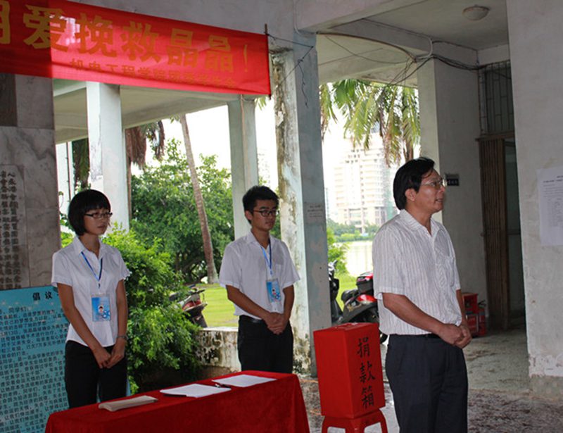 张晶晶同学,是一名活泼开朗,积极努力,品学兼优的学生,5月份被确诊为重型再生障碍性贫血,需要进行骨髓移植手术,而高昂的手术医疗费给她和她原本艰难的家庭以精神上和经济上的双重打击。海大师生向无助的张晶晶同学伸出了援手。 大爱无疆:爱心在校园内传递