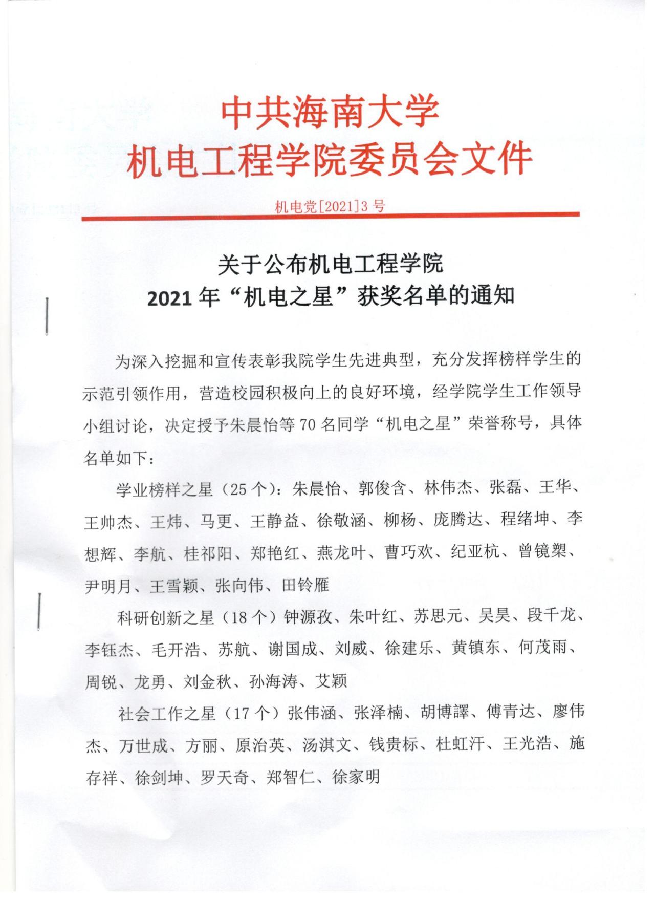 关于公布英国威廉希尔公司2021年“机电之星”获奖名单的通知