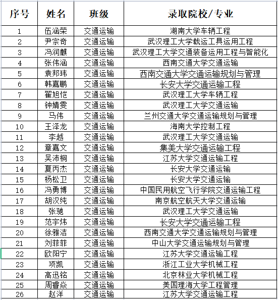 又是一年毕业季,2022年研究生复试录取工作已经接近尾声,英国威廉希尔公司考研喜报频传,其中,2018级交通运输本科毕业生录取情况喜人,交通运输班共有应届生51名,有26人保研或者考研成功,考研录取率为50.98%,较2021年同比增长19.98%。其中有20人被湖南大学、南京航空航天大学、西南交通大学等“双一流”高校录取为硕士研究生。