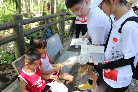 下午13点30分,调研团出发前往第二站——会山镇加脑苗寨。抵达目的地后调研团在村民委员会主任引导下进入苗寨。走访调研途中,调研团成员在村民委员会主任的介绍以及讲解下学习了解到部分苗族传统习俗。三月三青年男女对歌恋爱,由于加脑苗寨邻靠万泉河,三月三的传统习俗在这里与万泉河有了紧密的联系,青年男女以生生不息的万泉河为见证者来互表爱意;苗族人民崇尚自然,敬畏自然,他们深信万物有灵,在加脑苗寨也有着一颗树,承载着他们村里苗族人的信仰,那是村庄里年龄最大的一棵树,这颗年岁颇高的树被村中人敬称为“树神”,每逢过节,村里的苗族人会在树上系上红绸带来祈愿;走访途中,调研团还发现村里颇具特色的建筑墙体上绘有一幕幕苗族传统文化节日的场景,颇具生活气息的绘画将整个村庄装点成了一道靓丽的风景线。